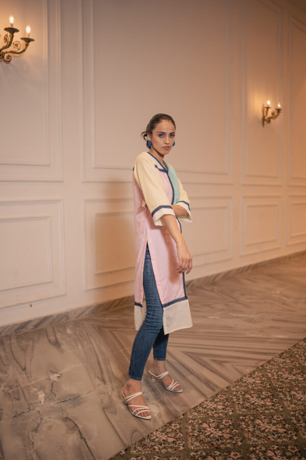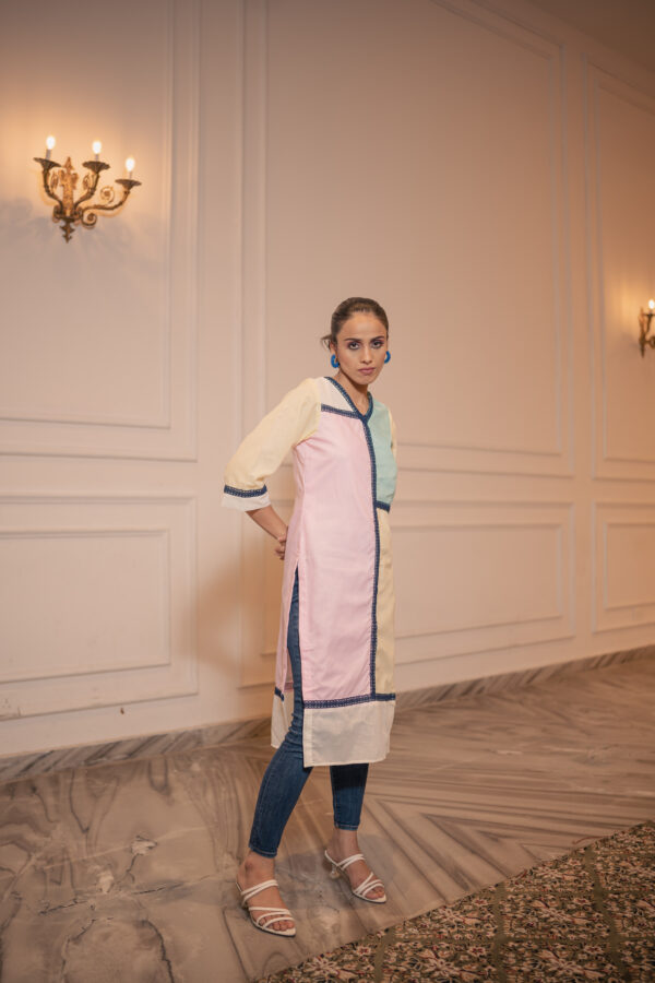 Mix and match with our versatile seperate. Rubai unveils a casual color block 100% cotton kurta which can be paired with jeans ,skirts ,plazzo, pants and here comes the laces to give the grace , the lace is asymmetrically placed to give it a unique look. Good for everyday wear.
