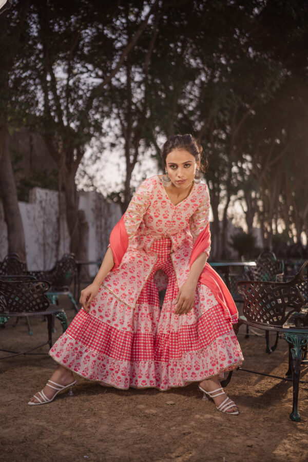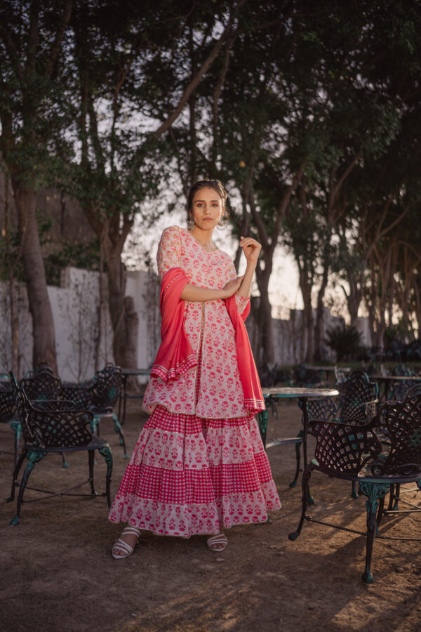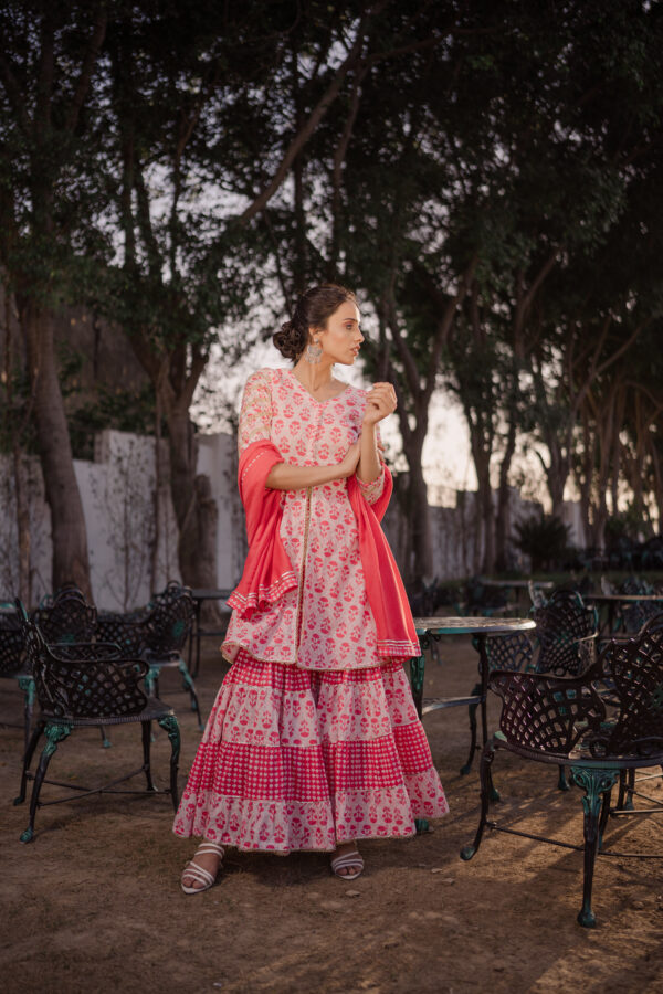 Experience the perfect combination of elegance and style with this stunning Pink Gharara Set with Dupatta. Perfect for any casual outing!