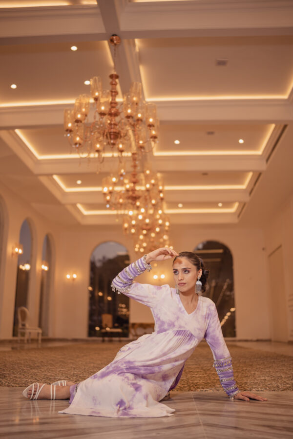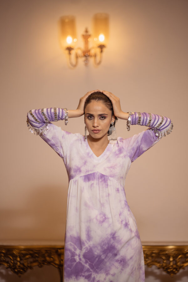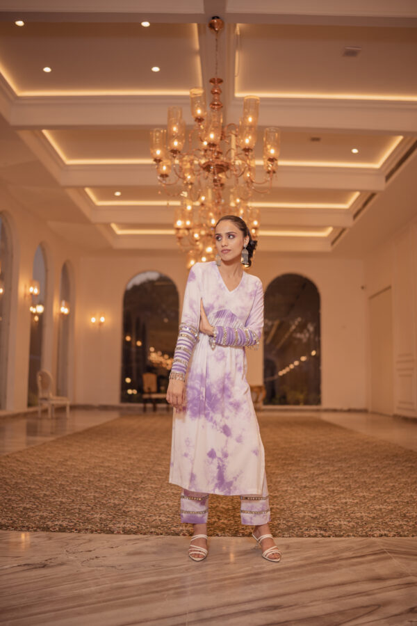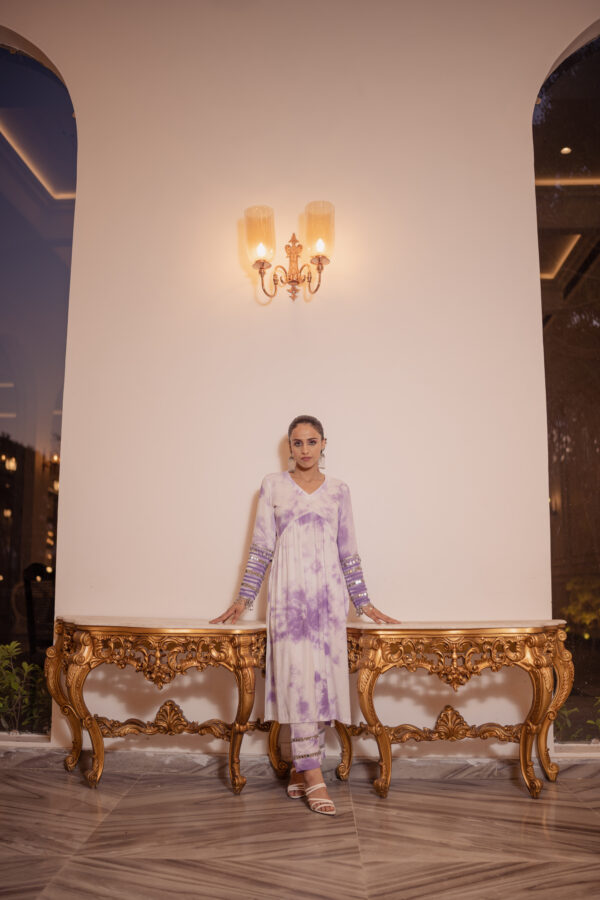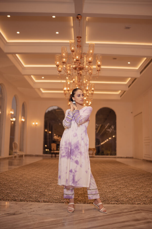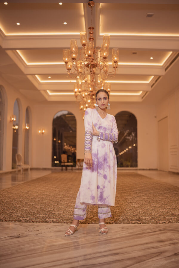 Where fashion meets function in our comfortable yet chic clothing. Here’s a hand tie dye set in white and purple made in modal cotton fabric, very breathable, good for kitty parties, ladies sangeet, cocktail nights. Cuffs are enhanced with mirror work and tassel laces and mirror work can be seen on the bottom too.