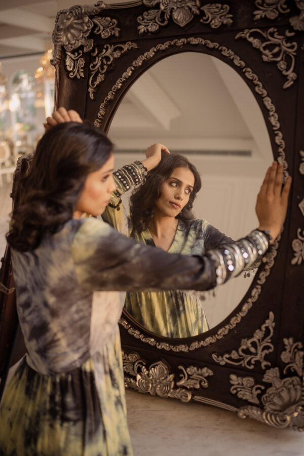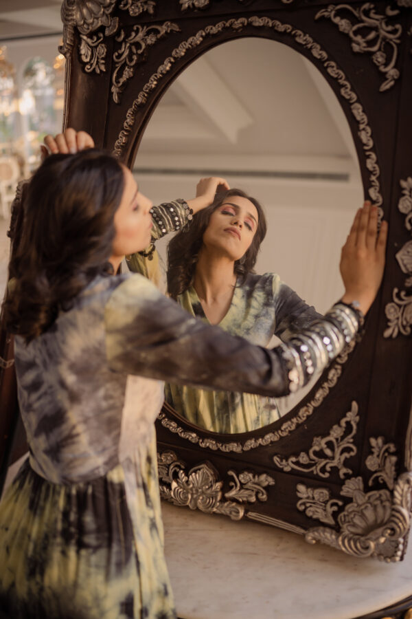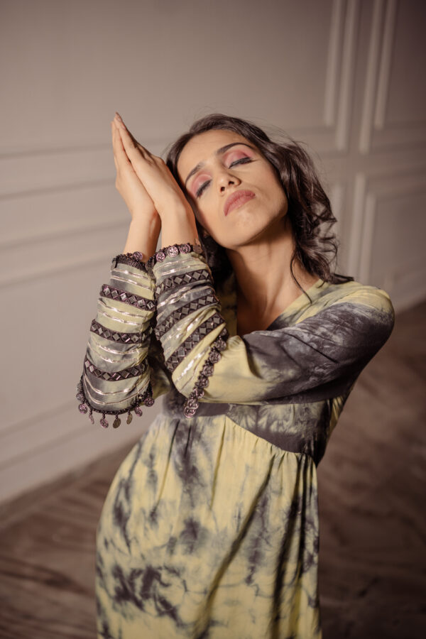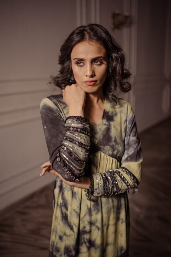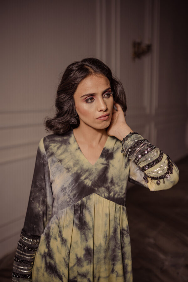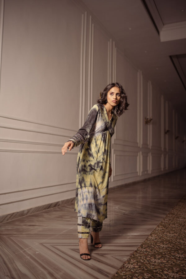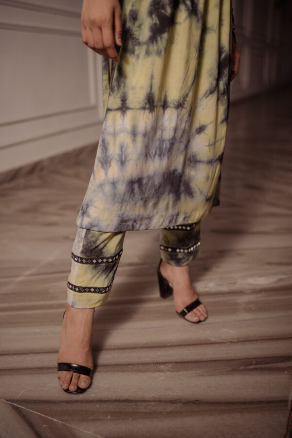 Classic with a tie-dye twist! Rubai introduces Top and bottom set which is hand tied a yellow, black and grey texture and the cuffs are enhanced with laces, mirror work and a long slit on Kurt